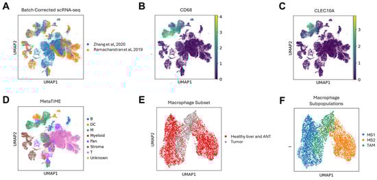 Macrophage cells from the batch corrected data were extracted using two sequential methods: computationally via MetaTiME cell type auto annotation algorithm and confirmed by manually visualizing known gene markers (macrophagesCD68+, dendriticCLEC10A+) [15] (Figure 1B,C). The MetaTiME pipeline was obtained from Omicverse a python package that consists of several scRNA-seq analysis tools including the MetaTiME pipeline. MetaTiME, an auto cell type annotation method that integrates a million single cells from scRNAseq library of tumors (omicverse: ov.single.MetaTiME) was used to annotate type M cells (macrophage/monocyte) (Figure 1D). Type M cell origin was confirmed manually through the UMAP plot, defining macrophage as MCD68+/CLECL10A−. M cells were subsetted and reclustered from normal and tumor samples; neighborhood and UMAP calculations were updated (Figure 1E, Supplementary Figure S2). All macrophages in tumor samples were defined as tumor-associated macrophages (TAM). Macrophage subpopulations (MS) in normal liver (adjacent and healthy donors) were defined based on known gene markers for M1 (S100A8, LYZ, CSTA, and CD74) and M2 (CD5L, MARCO, VSIG4, and CD163) macrophages (MS1, MS2) (Figure 1D).