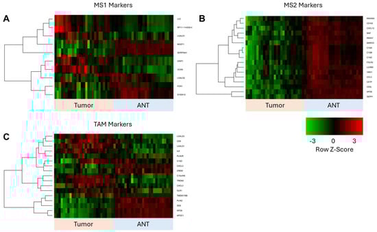 Validation of macrophage subpopulation (MS) gene markers identified from scRNA-seq analysis using bulk RNA-seq data from the ICC validation cohort. The top 30 upregulated genes from the scRNA-seq analysis for (A) MS1, (B) MS2, and (C) TAM are validated against DEGs from bulk RNA-seq data (ICC (tumor), n = 27; matched adjacent non-tumorous tissue (ANT), n = 27), with criteria of an adjusted p-value < 0.01 and a log2-fold change >1 or <−1. Genes that overlap between the scRNA-seq marker list and Bulk RNA-seq DEGs are presented as a heatmap.
