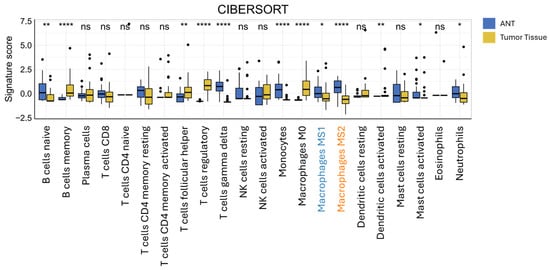 CIBERSORT analysis estimates the proportion of 22 immune cell types in ICC tumors and adjacent non-tumorous tissue (ANT). The estimated proportions of immune cell types are presented as box plots for ANT (blue, n = 27) and tumor (yellow, n = 27) tissue, utilizing the Immuno-Oncology Biological Research (IOBR) R package. (**** p-value < 0.0001, ** p-value < 0.01, * p-value < 0.05, and ns = not significant).