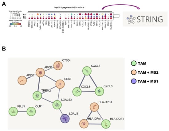 Protein–protein interaction networks of TAM-associated gene products. (A) The top 30 upregulated DEGs in TAM are analyzed using the STRING database, with their respective protein names. (B) A network represents TAM-associated proteins that are predicted to interact with other TAM-associated proteins (confidence level = 0.7). Proteins are color-coded: TAM-only proteins (green), both TAM and MS2 (orange), and both TAM and MS1 (purple).