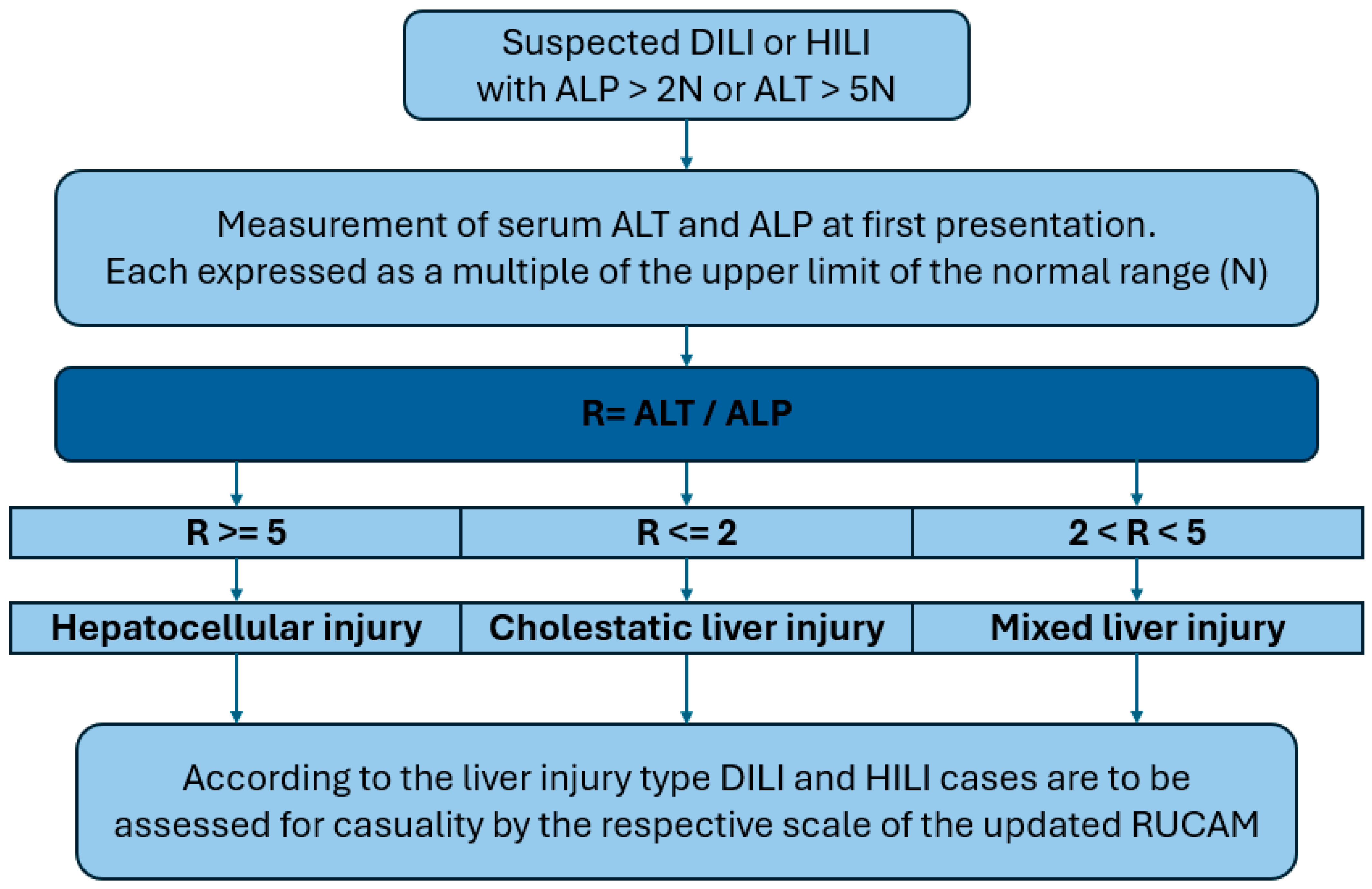 | 7 | Assessment of liver damage type | Hepatocelullar/cholestatic/mixed |