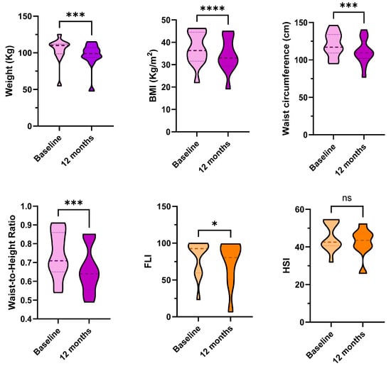 The anthropometric parameters at baseline are indicative of severe obesity, and FLI and HSI indicate the presence of hepatic steatosis, while fibrosis was not detected by the FIB-4 (Table 1).