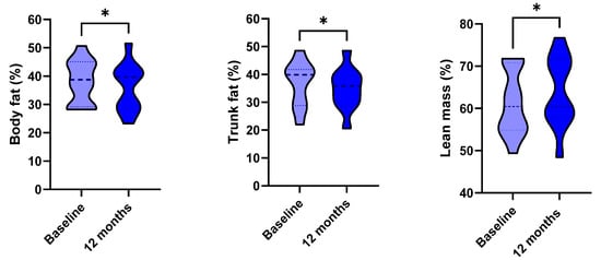 FLI significantly improved (from 92.68 (41.29) to 80.54 (46.88), p = 0.021, Figure 1, panel 2). The Pearson’s correlation between weight loss and Delta FLI was non-significant (p = 0.568). HSI and FIB-4 did not significantly change over time (respectively, p = 0.071 and p = 0.110). The DEXA-scans confirmed a slight amelioration of body composition, with a slight reduction of total body fat and trunk fat percentages (respectively, p = 0.023 and p= 0.02), and a slight increase in lean mass percentage (p = 0.023) (Figure 1, panel 3).
