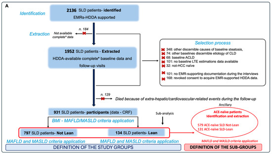 Enrolment flowchart and frequency distribution of study population groups. Panel (A)—Enrolment processes. SLD patients who gave consent to privacy data treatment on admission were identified and extracted from HDDA by entering in the search field of the main diagnosis the keywords “bright liver”, “steatosis”, and “fatty liver”. Patients presenting discernible causes of hepatic steatosis and CLD, at baseline and on follow-up, including excessive alcohol intake history, defined as ongoing or excessive (>350 g/week) alcohol intake in the previous 12 months, were excluded. * Complete data included anthropometrical, clinical, biochemical, and noninvasive tools (NITs), as well as the recording of the HCC occurrence, lifestyle habits, and drugs in the previous year. ACE-naïve subjects were independently further extracted from both NL and L patients to configure the study subgroups after applying the MAFLD and MASLD criteria. Panel (B)—Frequency distribution of study population groups and subgroups. Based on the baseline BMI, the enrolled patients were further divided into lean “L” (BMI < 25 kg/m2) and “not-lean” and, subsequently, by separately applying MAFLD and MASLD criteria, into NL-MASLD (n = 206), NL-MASLD/MAFLD (n = 481), NL-MAFLD (n = 110), L-MASLD (n = 39), L-MASLD/MAFLD (n = 68), and L-MAFLD (n = 27). ACE-naïve patients that were used to configure the study subgroups were NL-MASLD (n = 180), ACE-naïve NL-MASLD/MAFLD (n = 301), ACE-naïve NL-MAFLD (n = 98), ACE-naïve L-MASLD (n = 39), ACE-naïve L-MASLD/MAFLD (n = 66), and ACE-naïve L-MAFLD patients (n = 26). SLD: Steatotic liver disease; HDDA: Health Documents Digitization Archive; MASLD: Metabolic dysfunction-associated steatotic liver disease; MAFLD: Metabolic dysfunction-associated fatty liver disease; ACE: Acute cardiovascular event; BMI: Body Mass Index; CLD: Chronic liver disease; CRF: Case Report Form; EMR: Electronic medical records; ACLD: Advanced chronic liver disease; HCC: Hepatocellular carcinoma; LTE: Liver transient elastography; TOT: Total.