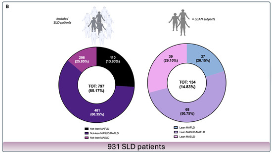 A total of 931 SLD patients (797 NL and 134 L) were ultimately enrolled and subdivided into 206 NL-MASLD, 481 NL-MASLD/MAFLD, 110 NL-MAFLD, 39 L-MASLD, 68 L-MASLD/MAFLD, and 27 L-MAFLD. The baseline characteristics (demographic, anthropometric, clinical, biochemical, and NITs) of the study population groups are reported in Supplementary Table S1 (Table S1).
