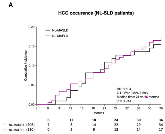 Compared to MAFLD, MASLD diagnostic criteria similarly estimated the 3-year risk of HCC occurrence in NL-SLD patients [NL-MASLD vs. NL-MAFLD, HR: 1.104, C.I 95%: 0.824–1.593, median time (in months): 21 vs. 16, p = 0.741] (Figure 3A). Consistently, during a median follow-up of 35.8 (6–36) months, the cumulative incidence of HCC at 12, 24, and 36 months was, respectively, 3.88%, 10.67%, and 16.51% in NL-MASLD and 1.81%, 11.81%, and 15.45% in NL-MAFLD (NL-MASLD vs. NL-MAFLD: p = 0.735).