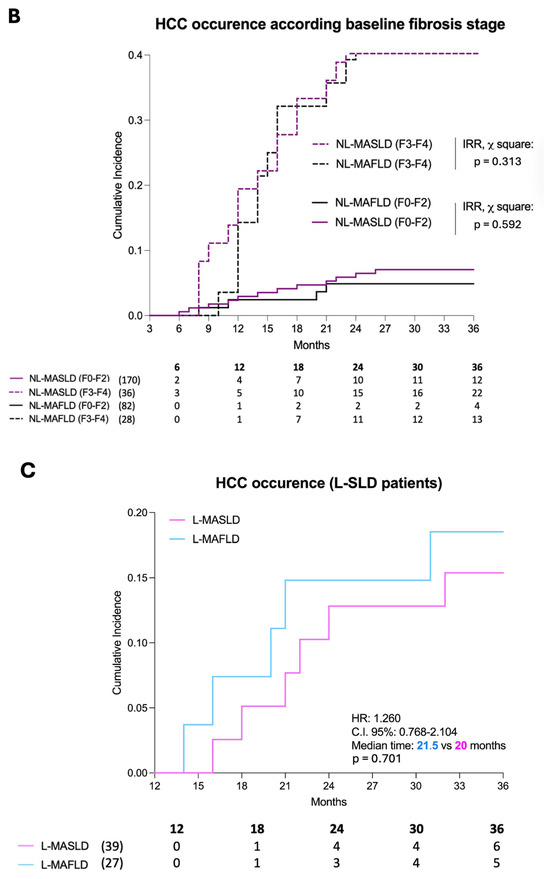 In line with NL-SLD patients, even the sub-analysis of lean individuals showed that MASLD criteria, compared to MAFLD, similarly estimated the 3-year risk of HCC occurrence [L-MAFLD vs. L-MASLD, HR: 1.260, C.I. 95%: 0.768–2.104, median time (in months): 21.5 vs. 20, p = 0.701] (Figure 3C). In this setting of patients, the cumulative incidence of HCC at 18, 24, and 36 months was, respectively, 2.56%, 10.25%, and 15.38% in L-MASLD and 3.70%, 11.11%, and 18.51% in L-MAFLD (L-MASLD vs. L-MAFLD: p = 0.664).