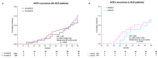 Consistently, the cumulative incidence of ACEs at 12, 24, and 36 months was, respectively, 1.11%, 6.67%, and 14.44% in NL-MASLD and 1.02%, 5.10%, and 13.26% in NL-MAFLD (NL-MASLD vs. NL-MAFLD: p = 0.265).
