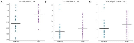 Figure 1. (A) Scatterplot of CAP Values. Difference in CAP values for patients with MetS compared to those without. Mean displayed by horizontal line for each group. (B) Scatterplot of LSM values. Difference in LSM values for patients with MetS as compared to those without. Mean displayed by horizontal line for each group. (C) Scatterplot of sqrtLSM values. Difference in sqrtLSM values for patients with MetS compared to those without. Mean displayed by horizontal line for each group.
