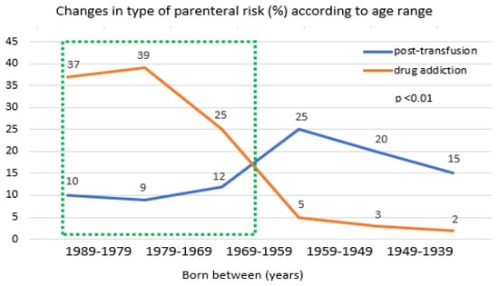In Figure 1, the changes in cases with parenteral exposure in relation to age range helped to monitor the transition of the two waves over time. The first one had mainly exposition to post-transfusion hepatitis and was particularly concentrated in those born between 1939 and 1969. The second appeared within the youngest subjects with the highest prevalence of drug users in the period 1979–1989, showing a significant decline after 1979 (p < 0.01).