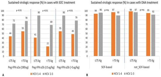 We also aimed to identify the factors associated with SVR in relation to dose and type of antiviral regimens used. In Figure 3A, during SOC treatment, body weight and HCV genotype 2 or 3 (easy to treat cases) were significantly associated with maximal SVR (90%), particularly among lighter patients (≤75 kg) treated with any Peg-IFN α2b dose (all, p < 0.01). Peg-IFN α2a fixed-dose and Peg-IFN α2b at HD produced similar SVR rate in cases with weight > 75 kg; in contrast, Peg-IFN α2b at LD proved inadequate for high-weight patients. Patients treated with DAA (panel B) achieved very high viral clearance rates among all genotypes, with a slight advantage in favor of HCV-1 or -4 infection. Thus, in the DAA era, HCV genotypes 2 and 3 appear to show greater therapeutic resistance and have become the more challenging genotypes to treat, particularly among treatment-experienced individuals.