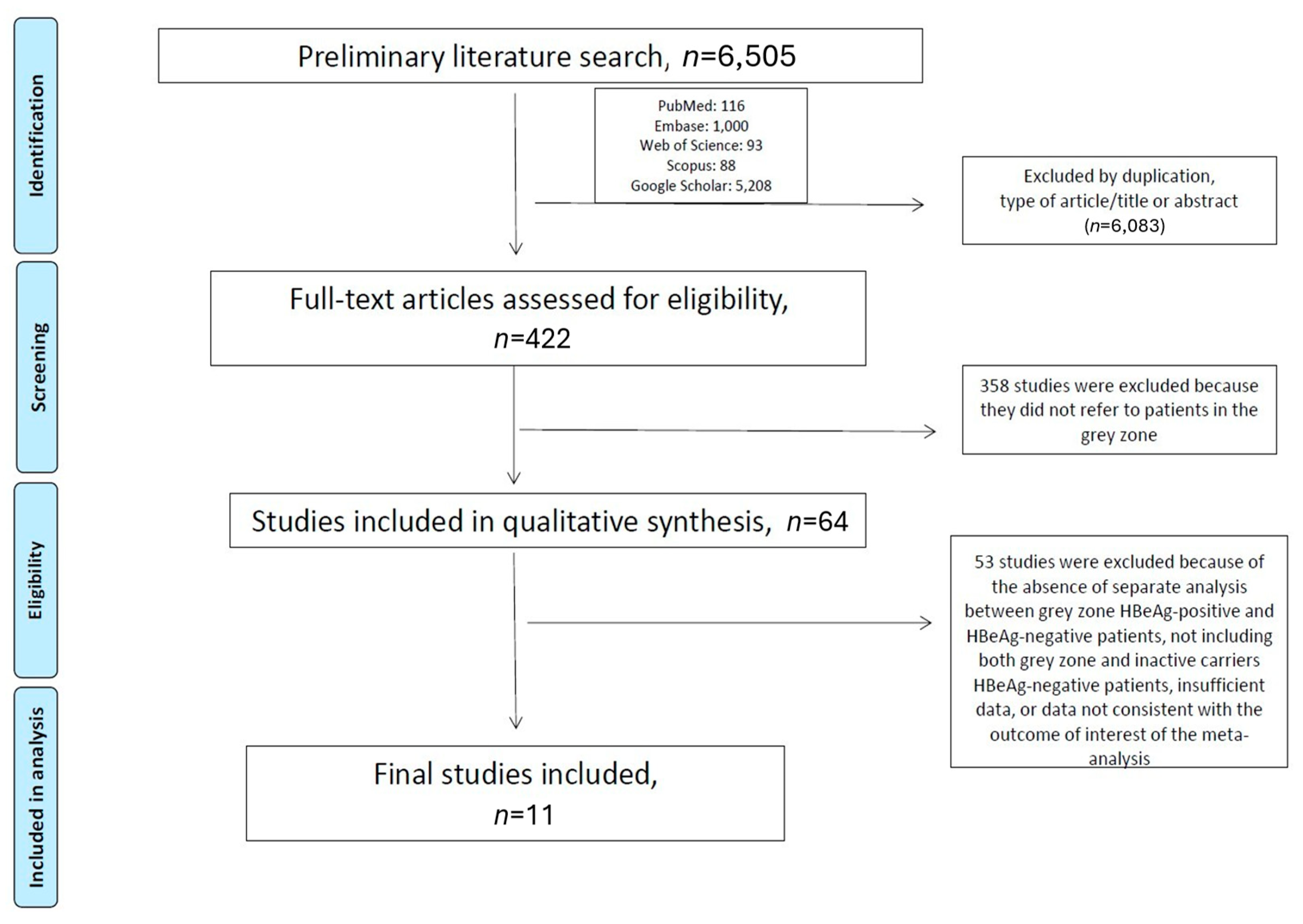 - Bonacci, M.; Lens, S.; Mariño, Z.; Londoño, M.C.; Rodríguez-Tajes, S.; Mas, A.; García-López, M.; Pérez-del-Pulgar, S.; Sánchez-Tapias, J.M.; Forns, X. Anti-viral therapy can be delayed or avoided in a significant proportion of HBeAg-negative Caucasian patients in the Grey Zone. Aliment. Pharmacol. Ther. 2018, 47, 1397–1408. [Google Scholar] [CrossRef]
