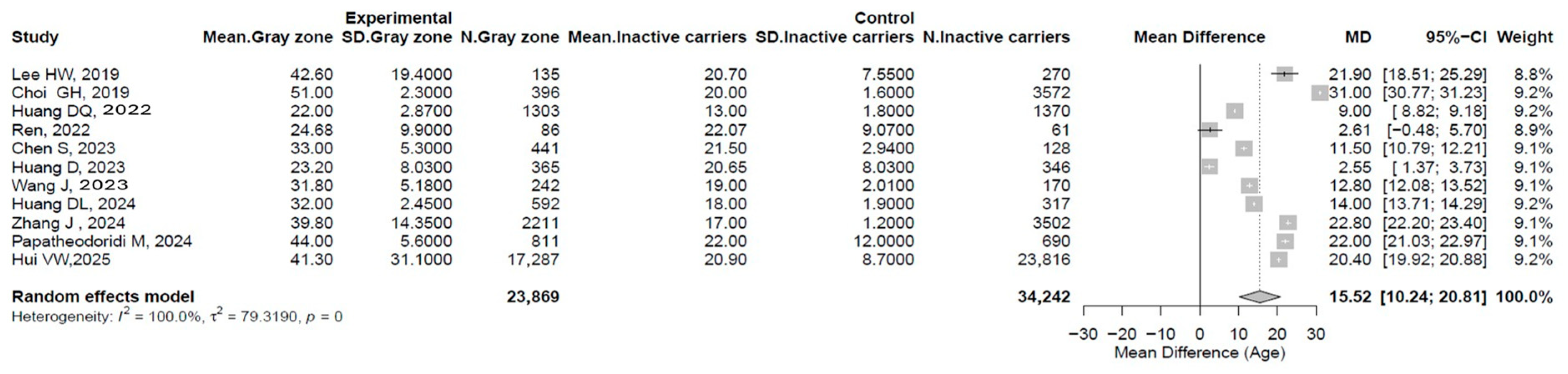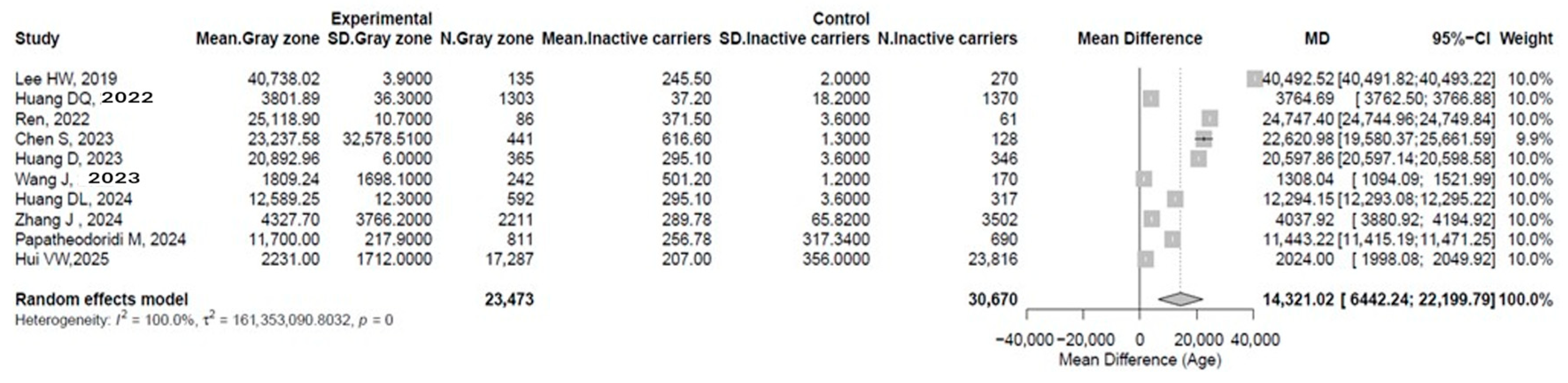 | Choi GH, et al. (2019) [19] | Asia | Retrospective | 5414 (55.8%) | 396 (77%) | 46 ± 10 | 251,188.6 | 51 ± 2.3 | 3572 (54%) | 47 ± 11 | undetectable | 20 ± 1.6 | 9 |