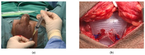 Operative view at the time of the ATOMS implant with a T-DOC air charged urethral catheter to perform intraoperative urodynamics. (a) Controlled system filling of the port through a perineal incision; (b) the ATOMS cushion inflated with variable volumes caused a change in intraurethral pressures that were registered by urodynamic equipment.