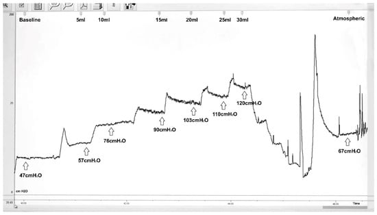 Example of continuous intraoperative registry that corresponds to patient ID 281568. ATOMS progressive filling with 5 mL serial increment from baseline to 30 mL is followed by total deflation and refill up to atmospheric pressure (Atmospheric). Intraurethral pressure in cm H2O (Y-axis) and filling volume in ml (X axis) are specified at each time point in the graph. In this patient, ATOMS cushion at atmospheric pressure with 8 mL increased urethral pressure to 67 cm H2O.
