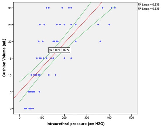 The regression analyses showed significant direct relationships between cushion volumes and intraurethral pressure (beta coefficient = 0.072 cm H2O/mL, p = 0.000). Intraurethral pressures increased mildly to moderately with filling under 15 mL (73 ± 22.7 cm H2O) but above 20 mL, there was a wide variability in the pressure increment (233 ± 108.9 cm H2O) (Figure 3).