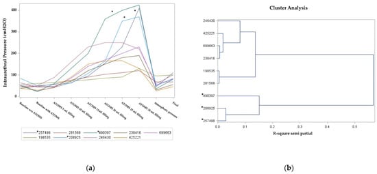 Intraurethral pressure for different cushion volume: (a) Stress test performed for each patient, expressed as ID number; (b) cluster analysis distinguishes two different patterns of intraurethral pressure. Patients in cluster 2 are marked with asterisks.