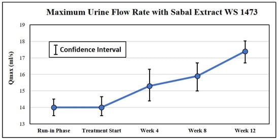 Data on maximum urine flow rate with the ethanolic extract of Serenoa repens (EESr) WS 1473 (Prostagutt Uno®) over a 12 wk study. Peak urinary flow rate (Qmax, mL/s) mean value curve with a 95% confidence interval reported. Modified based on Redecker et al. [49].