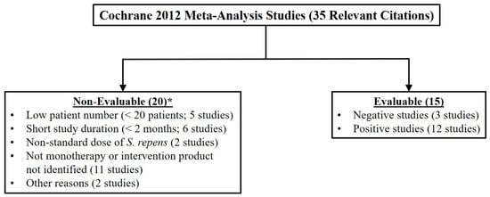 Cochrane 2012 patient evaluability. Of the 35 citations, only 15 were evaluable. Of those 15, only 3 were negative studies. * Some studies failed to meet evaluable criteria for more than one reason. Low patient numbers were identified in five studies, and a study duration of fewer than two months was found in six studies. Non-standard doses of Serenoa repens were noted in three studies, and nine studies did not involve monotherapy. In two studies, the intervention product and/or extraction technology could not be determined. Finally, one study had data that were not interpretable, and another article (Mohanty) did not specify the extraction technology.