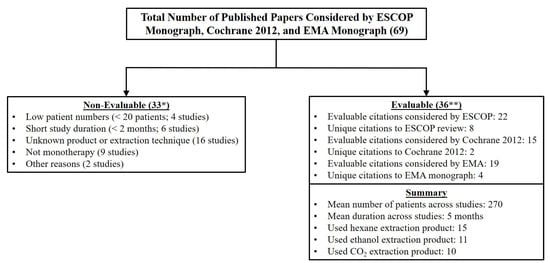 Categorization of 69 evaluable citations in ESCOP 2003, Cochrane 2012, and EMA 2014. * Studies could have more than one reason for exclusion. ** Of the 36 evaluable citations, 22 were considered by ESCOP (61%), 15 by Cochrane (42%), and 19 by EMA (53%). There were eight studies unique to ESCOP, two studies unique to Cochrane. EMA cited four studies not found in either of the other two reviews. CO2, carbon dioxide; EMA, European Medicines Agency; ESCOP, European Scientific Cooperative on Phytotherapy.