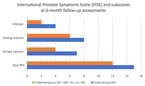 In this light, the present study was designed comparing a matched-paired cohort of 125 patients managed with Alfuzosin 10 mg monotherapy with 125 consecutive patients with mild to moderate LUTS previously managed only with Alfuzosin 10 mg and treated with a combination treatment of Alfuzosin plus SeR + SL + Ly + Br (Perlaprost®) over a 6 month period. We found that patients in the treatment group had a significantly improvement of the median IPSS score after 6 months of supplementation with similar results in terms of both storage and voiding symptoms. Particularly, a significative improvement was recorded in both storage subscore and in median number of night-time micturition. Conversely, unlike previous studies [,,], Qmax significantly improved after the 6-month supplementation comparing to the control group. Similarly, a significative decrease of PVR was reported at each follow-up visit, while only few studies in current literature reported SeR meaningfully influencing PVR [,,]. These findings may be explained by the higher concentration of supercritical CO2 lipidic extract contained in oral tablets of Perlaprost® which might maximize its anti-inflammatory and anti-edematous activity. Indeed, several series suggested SeR inhibition of cyclooxygenase and 5-lipoxygenase metabolites production and reduction in monocyte chemoattractant protein-1/Chemokine (C-C) motif ligand 2 (MCP-1/CCL/2) which stimulates monocyte recruitment and activation during inflammation []. Moreover, also the implementation of bromelain with an high concentration may act particularly on storage symptoms relief by enhancing the production of prostaglandins with anti-inflammatory activity [,]. Most importantly, in our experience, total PSA was significantly decreased after 3 months of combination treatment with no persisting benefit following the 6-month supplementation interruption. In this regard, the presence of both phytotherapeutic and nutraceutical extracts as lycopene and Solanum lycopersicum may have played a pivotal role. Indeed, the anti-inflammatory and anti-proliferative effects of these agents have been previously reported by Ford et al. [] who found a significative reduction of oxidative DNA damage in prostatic tissue and a local androgen signaling downregulation in patients with dietary supplementation of SL + Ly. In this light, all these properties are likely to counteract chronic prostatic inflammation playing a role in the relief of BPH-related LUTS.