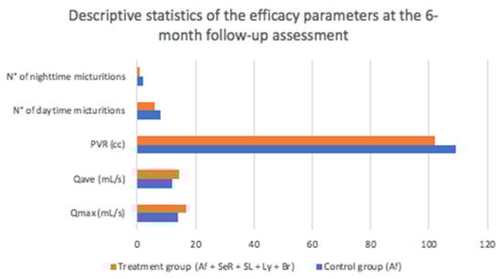 The primary endpoint of the study was to evaluate the changes of total IPSS and QoL scores between treatment and control groups at baseline and after 3 and 6 months. A particular attention was paid to changes in storage symptoms. The secondary endpoints were to assess the changes in PVR, total PSA values, voiding diary and median Qmax. The study design is represented within Figure 2.