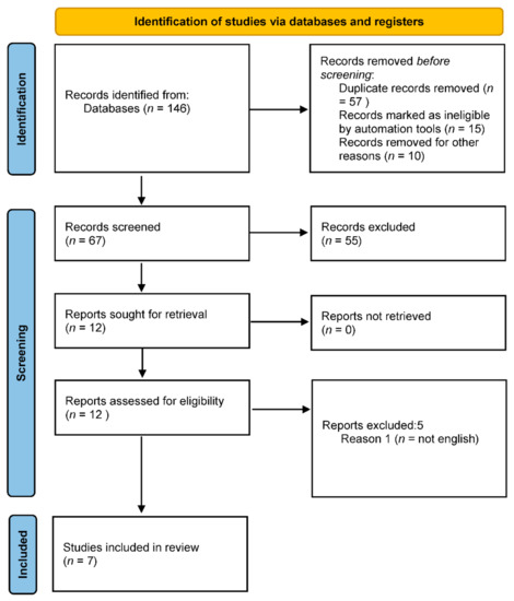 An initial selection of 146 articles was considered. After the exclusion of review articles, duplicates, conference abstracts, and non-English abstracts, 67 abstracts were selected for further evaluation. After a comprehensive screening process, 12 full text articles were eligible. Five studies were excluded (non-English full text) and seven full-text articles were finally included in this review, according to the aforementioned inclusion criteria. Figure 1 represents the PRISMA flowchart.