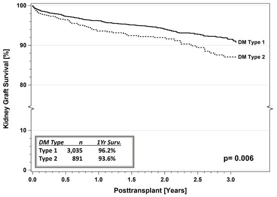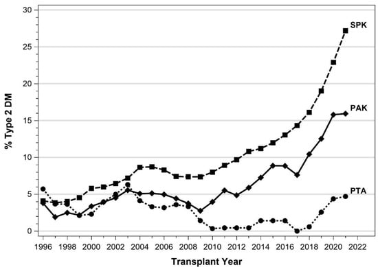 In patients who underwent kidney transplantation from 2000–2016, according to a Scientific Registry of Transplant Recipients (SRTR) analysis, only 641/35,849 (1.8%) with T2DM underwent SPKT []. Clearly, the proportion of SPKTs performed in patients with T2DM and ESRD should be higher if the procedure was generally recognized and accepted as a preferred treatment in selected patients. The etiology for SPKT underutilization (and under-appreciation) in T2DM is multifactorial and may be due to disparities in race, access, age, body size, co-morbidities, type of insurances, support networks, and perceived lower outcomes in SPKT recipients with T2DM compared to those with T1DM. Prior studies of SPKT in T2DM (defined by detectable pretransplant Cp levels) compared to T1DM have been limited to either larger registry or smaller single center reports without a suitable control group [,,,,,,,,,,,,,,,,,,,,,,,,,,,,,,,,,,,,,,,,,,,,,]. In the US, for every 1000 patients with ESRD and T1DM, only three will receive an SPKT in their lifetime. Because of the overlapping clinical presentations between T1DM and T2DM, detectable Cp has become less of a factor in establishing the “type” of diabetes [,,].