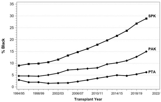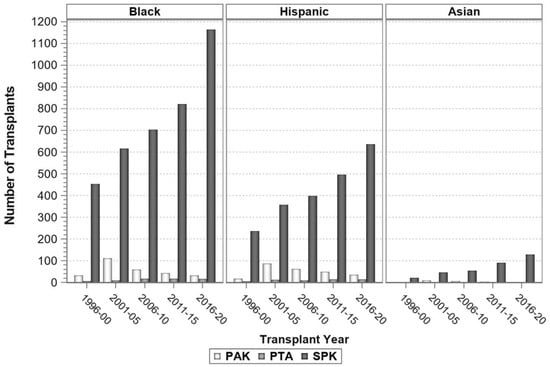 Several single center studies from South America have reported good outcomes in a predominantly Hispanic population, while other studies from China, Korea, India, and Japan have reported excellent outcomes in a predominantly Asian population [,,,,,,]. In 1997, the University of Miami group published one of the first reports of successful SPKT in Hispanic recipients with T1DM []. In a 2016 IPTR study of long-term (5-year) outcomes following PTx, Black race was associated with reduced pancreas and kidney and survival rates and “other” race with better graft survival rates versus patients identified as White []. In the IPTR report published in 2018, race was grouped as White, Black, Hispanic, Asian, and multiracial/other [,]. In the non-White groups, the number of SPKTs has increased in successive eras (Figure 3) whereas the number of SPKTs in Whites has remained static. A multivariate risk factor analysis demonstrated no effect of race on patient survival but Black race had a negative effect and Hispanic race a positive effect on both pancreas and kidney survival rates compared to Whites in the SPKT category.
