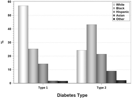 As previously noted, since year 2000 in the US, the annual percentage of patients with T2DM undergoing SPKT has steadily risen from 6% to 27% (Figure 1) concomitant with a progressive rise in the yearly percentage of AA SPKT recipients from 10% to nearly 30% (Figure 2) [,,,]. During this same period, the number of Hispanic and Asian SPKT recipients increased as well (Figure 3). For SPKT recipients with T1DM, approximately 56% were Caucasian, 25% AA, 15% Hispanic, 2% Asian, and 2% other ethnicity. On the other hand, for SPKT recipients with T2DM, 24% were Caucasian, 44% AA, 22% Hispanic, 8% Asian, and 2% other descent (Figure 4). Based on epidemiology and the prevalence of end stage diabetic nephropathy, however, non-Caucasian SPKT recipients should be proportionately greater if the procedure was performed objectively in different ethnic groups [,,,]. This discrepancy is multifactorial and probably due to disparities in insurance coverage, healthcare access and resources, social and caregiver support, health literacy, and the perception that minority SPKT patients (especially those with T2DM) have inferior outcomes versus Caucasian patients. According to data from 2017–2018, the age-adjusted prevalence of diagnosed T1DM is greater among minorities versus Caucasian adults []. Additionally, studies suggest that there is inferior metabolic control and an increased incidence of ESRD and other end organ injury in AA patients with T1DM compared to Caucasian patients [,]. Moreover, minority patients have decreased access to SPKT, which may be related in part to lack of referral because of concerns regarding inferior outcomes for non-Caucasian patients undergoing SPKT [,,,]. When reviewing prior literature (which is conflicting), compared to non-Hispanic Caucasian patients, AA SPKT recipients may have inferior patient and graft survival rates in both registry and single center reports [,,,,,,,,,,,,,,,,,].