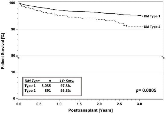 In the mid-1990s, the IPTR began reporting on outcomes in patients identified as having either T1DM or T2DM []. In these annual reports, SPKT recipients with T2DM rose from 4% prior to 2002 to 8% from 2002–2011 to 27% in 2021. At present, T2DM accounts for 16% of sequential pancreas after kidney (PAK) transplant cases and 4–5% of pancreas transplant alone (PTA) cases (Figure 1) [,,,,,,,]. The percentage of PTA recipients with T2DM has not changed substantially in the past 20 years whereas the proportion of PAK recipients with T2DM has increased from 4% to 16% [,,,,]. Shared characteristics of patients with T2DM (versus T1DM) include older age at PTx and at the time of diagnosis of DM, absence of autoantibodies and absence of need for insulin at time of initial DM diagnosis, higher body mass index (BMI), more frequently minority (not Caucasian) and male, and shorter duration of insulin therapy. In the most recent IPTR era, survival outcomes in SPKT are slightly inferior in patients with T2DM compared to those categorized as T1DM (Figure 5, Figure 6 and Figure 7) [,,,]. This is the first time that IPTR data has shown any differences in SPKT outcomes according to type of diabetes.