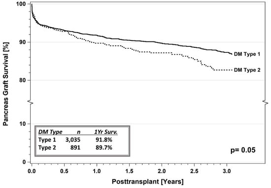 In another UNOS database study published in 2020 by Alhamad et al., outcomes were analyzed in 35,849 patients with T2DM and chronic kidney disease including 641 SPKT, 10,888 living donor kidney, and 24,320 deceased donor kidney transplants performed between 2000 and 2016 []. Because the study purpose was to analyze the effect of 3-month pancreas allograft function on long-term outcomes, early deaths and kidney graft losses were excluded. A total of 40 patients (6.2%) experienced early pancreas graft loss in the SPKT group. SPKT recipients were more likely to have a lower BMI and a lower PRA level, be male and younger, but less likely to receive a zero-human leukocyte antigen (HLA) mismatch organ than kidney alone recipients. Deceased donor kidney transplant alone recipients had longer dialysis times and higher PRA levels compared to SPKT and living donor kidney alone recipients. Donors for deceased donor kidney alone recipients were older, more commonly obese or hypertensive, and had longer cold ischemia times compared SPKT and living donor kidney alone recipients. The highest long-term (up to 10 years) kidney and patient survival rates occurred in SPKT recipients with both kidney and pancreas grafts functioning at 3 months. However, in those SPKT recipients with early pancreas graft loss, the beneficial long-term survival effect of SPKT compared to either living or deceased donor kidney transplant alone was no longer apparent. The authors speculated that the survival advantage of SPKT is a consequence of not only long-term euglycemia but also differences in donor and recipient characteristics as well as possibly a reduced waiting time and selection bias. During the period of study, for patients identified as having T2DM, only 2% underwent SPKT and the remaining received a kidney alone transplant. Similar to previous studies in T1DM, the authors concluded that T2DM patients also experience a similar survival benefit with SPKT compared to kidney transplant alone if pancreas graft failure does not occur in the first 3 months posttransplant. Moreover, SPKT as a treatment option for patients with T2DM and ESRD may be underutilized.