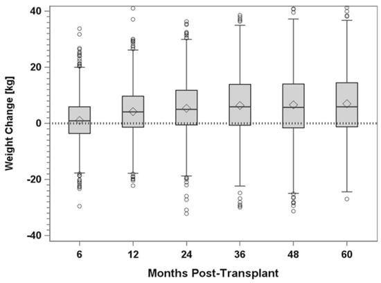 In 2017, Gruessner et al., reported outcomes of PTx in patients with T2DM in three eras: era 1, 1995–2001; era 2, 2002–2008; and era 3, 2009–2015 []. Of the 1512 cases analyzed, 1322 were primary SPKT and the remaining 190 were PTA or PAK recipients. When comparing the 3 eras, an increasing number of SPKTs were performed in patients with T2DM relative to those with T1DM. There was an improvement in survival outcomes in each successive era along with a reduction in early pancreas graft losses. Risk factors for patient death were either a failed kidney and/or pancreas graft, recipient age > 43 years, and being AA. Death with a functioning graft was the major cause for either pancreas or kidney graft failure even though mortality decreased in each successive era. Notably, DM recurrence was rare except in the setting of excessive posttransplant weight gain (Figure 8) []. However, in 70% of male and 75% of female recipients, substantial weight gain did occur. Multivariate risk analysis for pancreas graft loss in the first 36 months posttransplant demonstrated that recipient BMI > 28 kg/m2 (compared to those < 25 kg/m2) and donor age > 30 years were the most predictive factors. However, there was no difference in pancreas graft failure for overweight or obese recipients (BMI > 28 kg/m2) compared to recipients with a normal BMI (25–28 kg/m2). This finding was corroborated by Al-Qaoud et al., in a study of SPKT in non-obese recipients (BMI < 30 kg/m2, n = 500) compared to obese recipients (BMI > 30 kg/m2, n = 88) from 2004 to 2014 using the United Network for Organ Sharing (UNOS) database [,]. In this study, 5-year pancreas survival rates were 76.3% in the low BMI compared to 74.2% in the high BMI cohorts and the majority of high BMI recipients clustered within a BMI range of 30–33 kg/m2.
