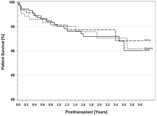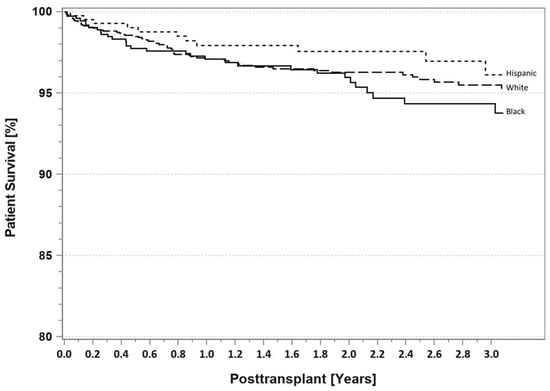 SPKT patient survival according to recipient race in patients identified as having T1DM in the latest era (1 January 2017–31 December 2021).