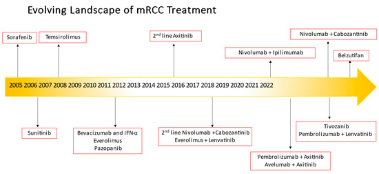 Renal cell cancer afflicted about 79,000 patients in 2022 and was responsible for deaths of about 13,920 patients in the United States [1]. About one-third of patients in the United States diagnosed with kidney cancer have advanced disease at the time of diagnosis, and those with distant metastases historically had a low 5-year relative survival rate of only 15%. Clear cell renal cell carcinoma comprises the most common histology for all renal cell carcinomas [2,3], and is the main focus of this review. While surgery has been the primary treatment for early-stage, resectable renal cell carcinomas (RCCs), the treatment of metastatic clear cell retablenal cell carcinoma has evolved from interleukin therapy to VEGF-TKIs over the years, and in recent times to the use of ICIs or immuno-oncology (IO) therapies. In addition, the evolution of combination regimens (IO/VEGF-TKIs or IO/IO) as first-line treatment has improved survival outcomes in these patients and frequent discussion regarding toxicities, sequencing, and treatment resistance often abounds. Choice of therapy hinges upon multiple factors although the use of a prognostic model with the International Metastatic Renal-Cell Carcinoma Database Consortium (IMDC) criteria is still the basis for most contemporary clinical trial risk stratification and treatment assignment [4]. This review discusses the evolution of treatment from front-line therapy to second-line treatment in specific timelines (see Figure 1) not just in the VEGF-TKI era but most especially in the contemporary management of mccRCC after IO exposure.