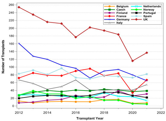 Number of pancreas transplants between 1 January 2012 and 31 December 2021 for selected European countries.