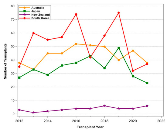 In Oceania and South America, transplant programs were thriving (Figure 3 and Figure 4) and a constant increase in transplant numbers was noted. In New Zealand, the number of transplants was limited, with a stable number of procedures. In South America, Brazil and Argentina reported increasing transplant activities until the start of COVID-19. Smaller countries such as Chile, Columbia, Ecuador, and Peru performed only few pancreas transplants over the period. The Middle East (Figure 5) also reported thriving transplant activities. Iran and Saudi Arabia reported increasing numbers of transplants, while the numbers in Turkey declined significantly. In Israel, the numbers remained stable over time.