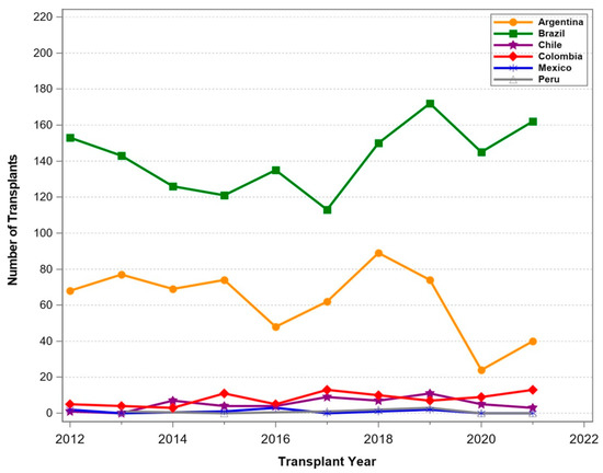 Number of pancreas transplants between 1 January 2012 and 31 December 2021 for selected South American countries.