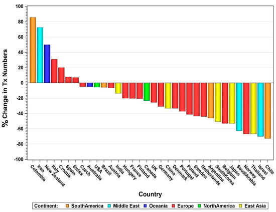 Percentage change of transplant numbers between 2019 and 2021 by country.
