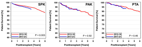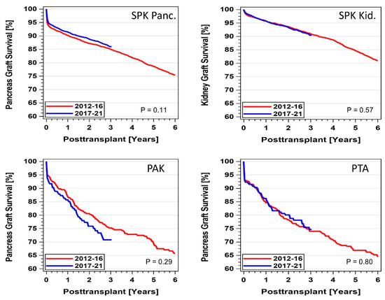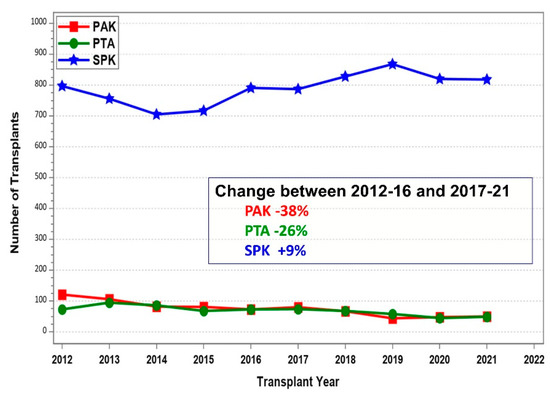Of concern is the drop in PAK during the analyzed period. This approach offers the diabetic patient the opportunity to receive first a living or deceased kidney to correct uremia as soon as possible. Later, a solitary pancreas transplant can be performed when a good pancreas graft is available [17,18,19]. The outcomes of PAK have not reached the results for SPK, and with the decline in numbers and centers no real improvement was noted during the past decade. PAK can be a life-preserving procedure because it avoids long-term dialysis and mortality on the waitlist. It provides the opportunity to find a good pancreas graft after the kidney transplant, to correct the underlying diabetes and provide excellent metabolic control [21]. A kidney transplant alone corrects only the secondary diabetic complication but not the reason for the underlying problem. A recurrence of diabetic nephropathy can be detected some years post-transplant, but other diabetic complications may progress. Nevertheless, many centers have ceased to perform PAK.