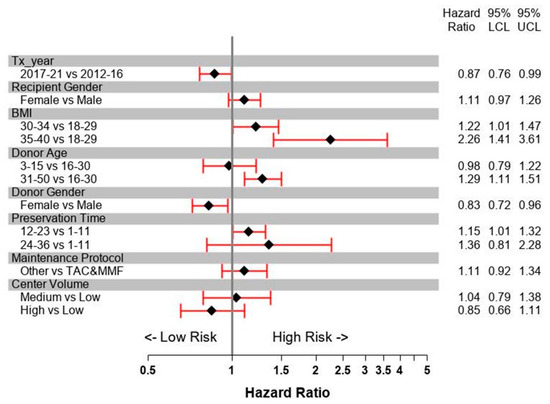 For the first 3 years post-transplant, the most influential recipient factors for SPK pancreas graft failure were gender and BMI (Figure 13). A recipient BMI over 35 kg/m2 more than doubled the risk for graft failure. Donor risk factors were age over 30 years and male donor gender. Preservation time over 12 h also increased the risk of graft failure. Maintenance protocols which were not based on the combination of tacrolimus with mycophenolate mofetil (MMF) showed a higher but nonsignificant increase in risk. With an increase in center volume, the risk of pancreas failure decreased. The multivariable model showed a significant decrease in the risk of pancreas graft failure for 2017-21 compared to 2012-16. Recipient age, diabetes type, race, pre-transplant cPRA, being on dialysis, HLA mismatch, and drainage technique did not impact outcome.