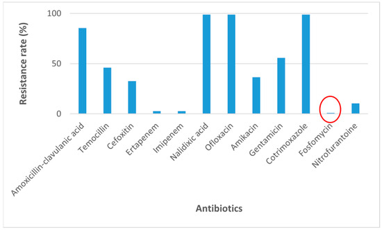 Interestingly, our findings showed very low resistance rates towards fosfomycin (0.97%), carbapenems (2.88%), and nitrofurantoin (10.58%) (Figure 2).