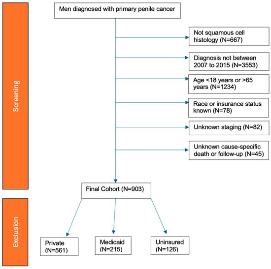 Cohort selection and exclusion criteria are outlined in Figure 1. After the exclusion criteria were applied, there was a total of 903 patients who were diagnosed with penile squamous cell carcinoma from 2007 to 2015. The mean age for the cohort was 53.0 years old (SD 8.95), and the median follow-up time was 38.0 months. In this study, 561 patients (62.1%) were insured with privately insured, 215 patients (23.9%) were insured with Medicaid, and 126 patients (14.0%) were uninsured