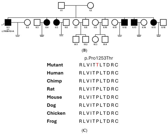 The DNA from both probands was subjected to genome sequencing. The TruSeq Nano DNA High Throughput Library Prep Kit (Illumina®) was used to prepare the libraries, which were sequenced using the 150nt pair-end protocol on an Illumina platform to yield an average coverage depth of 30x for the nuclear genome. Raw read alignments to the reference genome GRCh38 were performed. No other genetic variants in the known genes associated with infertility were found in either proband. However, novel variants in the DNAH12 gene (NM_001366028.2) were identified. The proband in family 1 was found to carry a novel homozygous missense variant (c.3757C>A, p. Pro1253Thr), located in exon 25. This variant was found with a minor allele frequency (MAF) of 0.0000066 in gnomAD (10 carriers and no homozygotes). This variant is not listed in ClinVar. The CADD [11] and REVEL [12] scores for this variant were 25.8 and 0.63, respectively. The proband in family 2 was identified as carrying a novel homozygous splicing variant (c.11086-1G>A, p.?), affecting the canonical site, and the skipping of exon 69 out of 74 by this variant causes a frameshift. The variant is located in intron 68, and the minor allele frequency (MAF) is zero (absent) in gnomAD. The variant is not listed in ClinVar (see Figure 1).