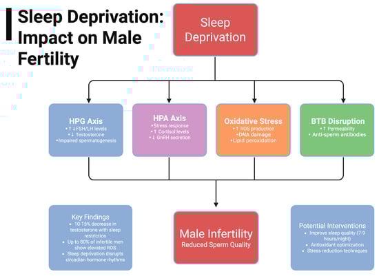 The relationship between testosterone and sleep deprivation has been extensively studied. Numerous studies have demonstrated an association between prolonged sleep deprivation and a reduction in total testosterone levels. However, it is important to note that additional factors, such as sleep disruptions associated with obstructive sleep apnea (OSA), have also been shown to be correlated with decreased testosterone levels. Furthermore, early awakening is associated with reduced testosterone levels, rather than overall sleep deprivation. While insomnia and obstructive sleep apnea interfere with sleep in distinct ways—reducing duration versus causing fragmentation—they both contribute to hormonal changes and fit within the broader concept of sleep deprivation, which includes poor sleep quality as well as insufficient quantity. Despite these findings, there remains much to explore in the complex relationship between sleep and testosterone levels. Nevertheless, sleep deprivation or loss is associated with decreased testosterone levels, which have been shown to have a detrimental impact on male fertility (Figure 1).