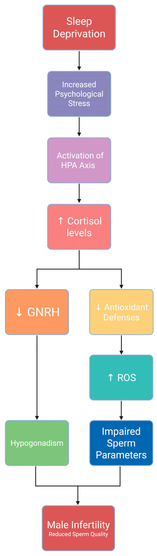 Sleep deprivation activates the HPA Axis, leading to an increase in cortisol production [9]. As a physiological stressor, sleep deprivation triggers the hypothalamus to release Corticotropin-Releasing Hormone (CRH). CRH stimulates the pituitary gland to release Adrenocorticotropic Hormone (ACTH), which prompts the adrenal glands to produce cortisol [9]. Normally, cortisol levels peak in the morning and decline throughout the day. However, sleep deprivation results in chronically elevated cortisol levels. Elevated cortisol decreases GnRH production, negatively impacting FSH, LH, and testosterone, which are essential for reproductive function.