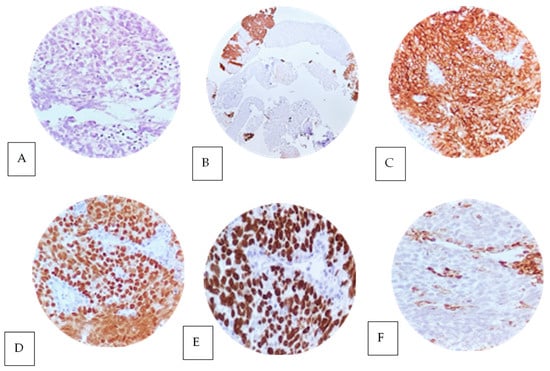 Subsequently, a trucut biopsy of the retroperitoneal conglomerate was performed. Histology showed a germ cell tumor with a solid pattern, composed of uniform cells with well-defined cell membranes, pale cytoplasm, and polygonal nuclei with prominent nucleoli, compatible with pure seminoma (Figure 4A). Immunohistochemistry was essential to confirm the diagnosis, showing intense and diffuse positive staining for PLAP (membranous/cytoplasmic) (Figure 4B,C), and nuclear staining for OCT3/4 (Figure 4D) and SALL4 (Figure 4E) in the neoplastic cells. While, in the differential diagnosis, staining for CD45 was negative in the tumor cells and positive in the peritumoral lymphocytic infiltrate (positive internal control) (Figure 4F).