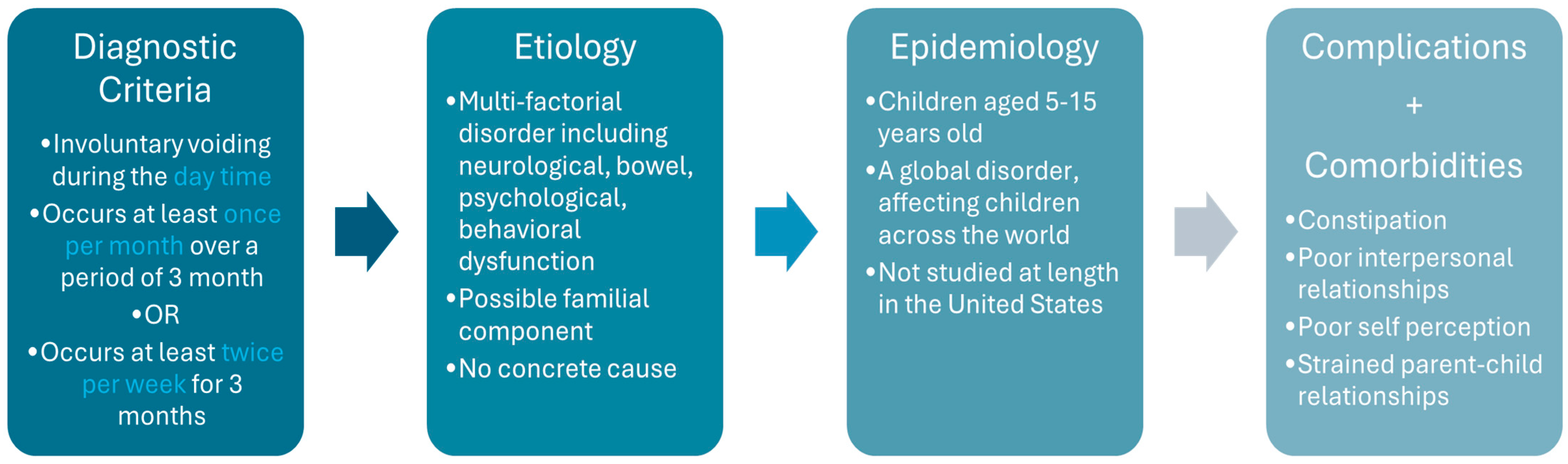 DuPont, A.; Little, C.; Vuong, V.; Martino, R.; Flaminio, Z.; Ferrill, H.; Brooks, B. Dissecting the Development of the Evaluation and Management of Pediatric Diurnal Enuresis. Uro 2025, 5, 21. https://doi.org/10.3390/uro5040021