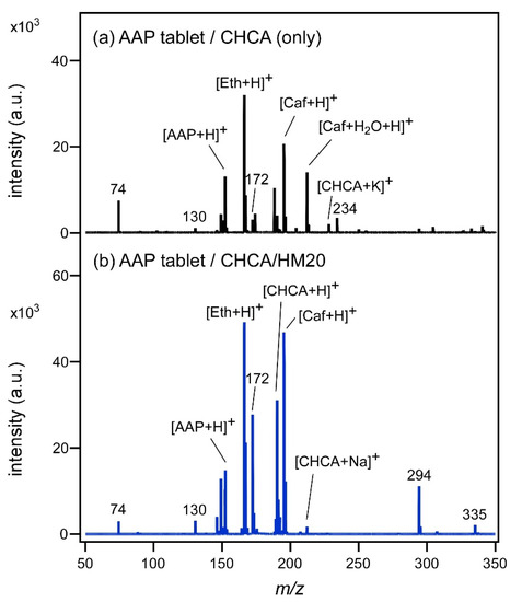 Figure 1a. Furthermore, the intensities of the peaks increased; AAP was increased by 1.14 times, Eth by 1.55 times, and Caf by 2.28 times. Therefore, it was clarified that such chemical substances as AAP, Eth, and Caf could be ionized effectively by SALDI using CHCA/HM20. The AAP tablet contains hydroxypropyl cellulose, calcium silicate, α-starch, and magnesium stearate in addition to the above three ingredients. Therefore, some of the unknown peaks may have been derived from these substances. The