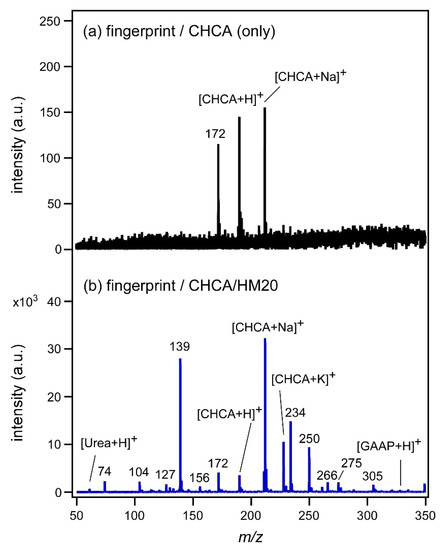 Figure 2b shows the SALDI mass spectrum measured using CHCA/HM20. The use of zeolite significantly enhanced the peaks related to CHCA. Furthermore, some peaks assignable to chemical species in the fingerprint could be observed. For example, the peak of protonated urea, [urea+H]